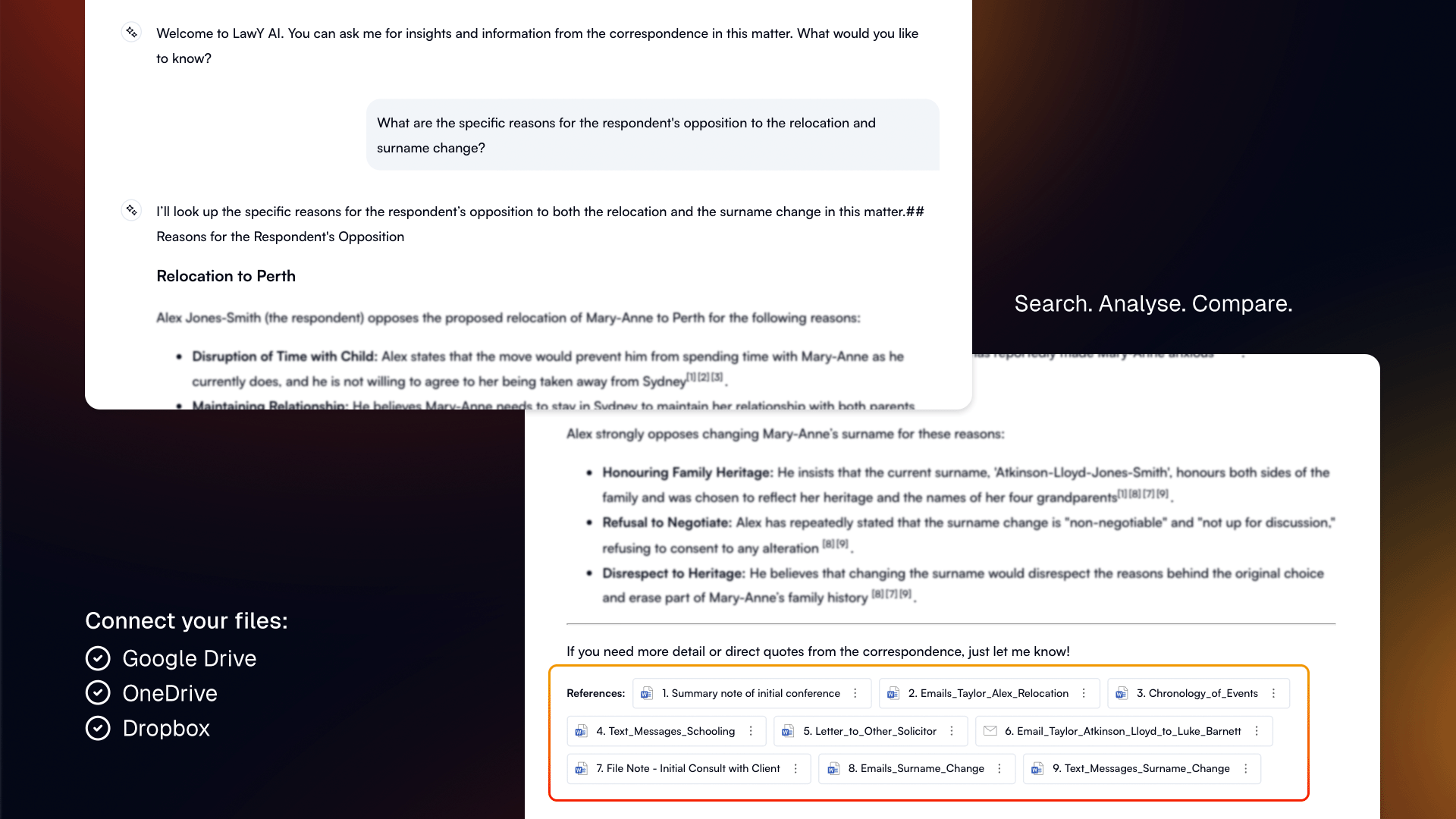 If your documents are stored in practice management software like ActionStep, LawY can't directly access them. You'll need to copy those files into OneDrive, Google Drive, or Dropbox first so LawY can analyse and work with them.